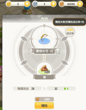 每次精炼需要消耗不同的材料 右上角有成功率,精炼等级越高,精炼成功率越低。当然,失败后,迦南勇者们不要灰心,精炼失败后会+5%成功率哦~