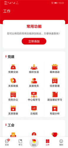 包含信息资讯、业务管理、学习教育、线上活动、交流服务、考核监督六大平台。