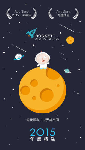 全球最具设计和趣味的火箭闹钟, 融合了iPhone内置的加速计、重力计、摄像头,以及麦克风来增加交互的趣味性,残忍又小清新,你需要疯狂摇晃手机,解答极其可怕的数学题,还要完成对着手机微笑和吹气等各种任务才能关闭闹铃!