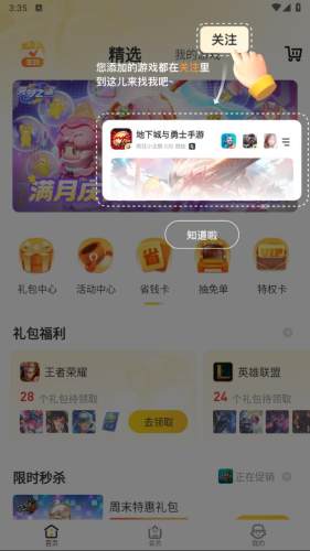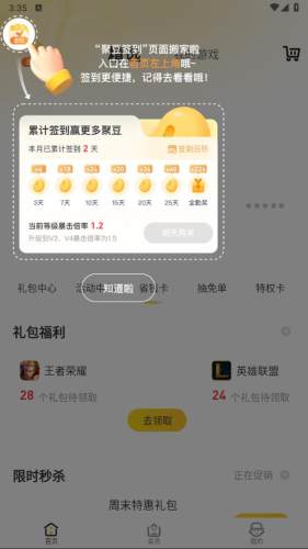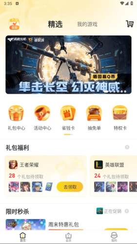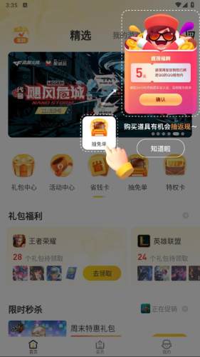 1、打开软件在首页中有礼包中心、活动中心、省钱卡、抽免单、钻石挑战等服务;