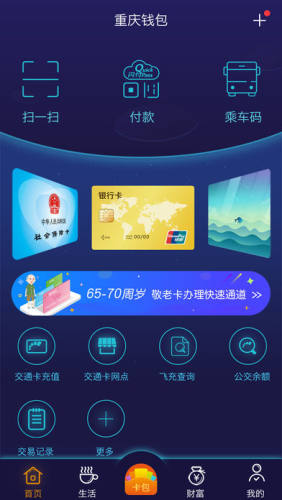包括生活、财富、卡包及账户四大版块。用户将银行卡、公交卡、会员卡等金融IC卡虚拟到APP中,出门不需再带各种卡片,通过手机二维码即可实现便捷刷卡消费。