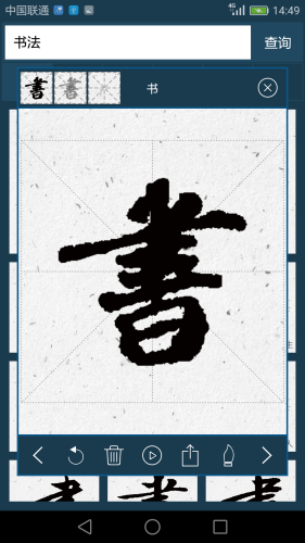 一百多万张书法字体图片,汇集古今2000多位书法家真迹,可查询行、草、隶、篆、楷五种书法字体,支持多字同时查询,高清真迹字帖图片,支持手写临摹,可设置笔头粗细、类型,可播放手写的笔画动作,可保存临摹作品成图片。