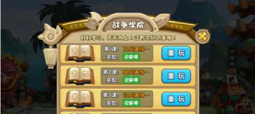 战争学院目前分为两个等级共六个关卡,其中前三关分别对应第一级的刀兵演练、骑兵演练和弓兵演练。只要你依照教学操作,可以很简单地通过这三个关卡,并在过关后获得相应的元宝奖励。