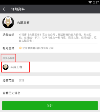 注意:暂提供“头脑王者”官方微信公众号,可在公众号中,进入小程序