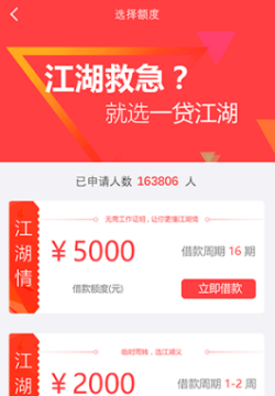 一贷江湖app,一款非常实用的手机借款软件。平台为用户提供双重额度供你选择,完全线上申请,简单迅速,轻松放款,解决您的燃眉之急,非常方便!