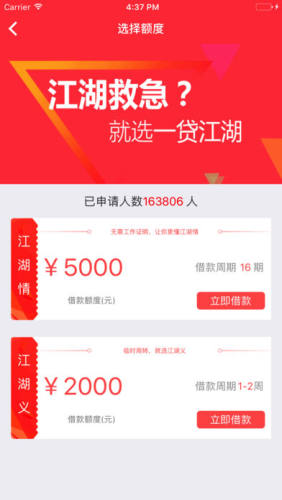 明星产品“江湖情”和铂金产品“江湖义”,大额度即提即到,满足个人消费所需。