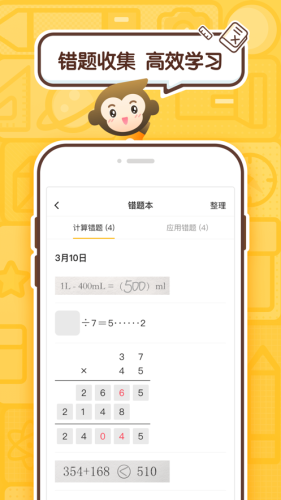 3、口算练习,手写作答:口算题目覆盖学龄前及小学各年龄段学生,其中口算练习、竖式计算及单位换算均可手写作答;作答错误的题目还可以被收录在错题本内,进行针对练习,有效提升学习成绩