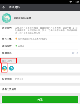 注意:暂提供“去哪儿网火车票”官方微信公众号,可在公众号 中,进入小程序