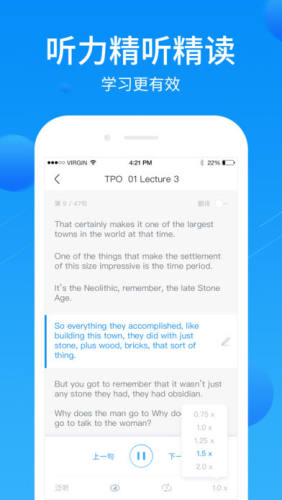 精听模式训练,以句为单位精确切分,支持音频变速,单句反复练习,迅速提升听力水平