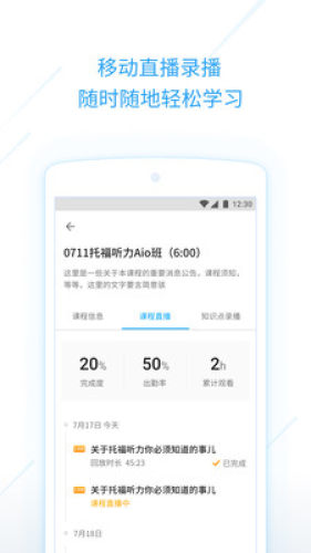 结合课程内容,移动展示课程直播和知识点录播,随时随地轻松上课;