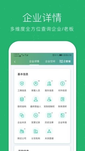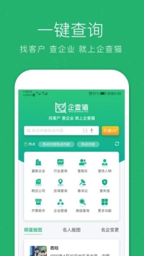 企查猫企业查询app是一款可以快速查询企业和企业老板工商背景信息的强大商业支持工具。企查猫企业查询app覆盖全国1.2亿+企业信息,企业数据全面、真实、有效。只要输入需要检索的企业名或人名,就可快速查到企业的工商信息、联系方式、股东高管、股权结构、对外投资、商标专利、法院诉讼、信用状况、关系图谱等。