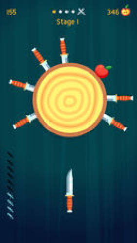 点击屏幕,将下方飞刀仍到旋转的飞盘上,直到飞刀全部用完,且不能撞到其他飞刀哟!