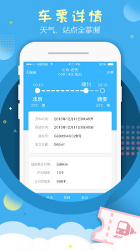 一起坐火车是一种时下最新的交友方式,你只需要输入你的行程的具体时间和车次,软件就会根据实际情况为你推荐与你同行的旅客,让你在旅途中交友。觉得这款软件还不错的朋友快来下载吧!