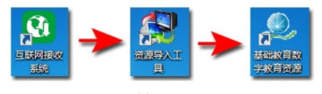 程序安装完成后,三个快捷方式启动图标,“互联网接收系统”为资源接收程序,资源导入工具为资源入库程序,基础教育数字资源为资源展示程序。接收资源时,软件的运行顺序应该是:互联网接收系统→资源导入工具→基础教育数字教育资源。