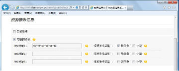 填写资源接收信息的时候,互联网接收机最多说那个,再接收机上安装“互联网接收系统”之后,通过接收系统就可以直接查看接收机的MAC地址,每个接收机都需要选择互联网接收的资源类型,资源类型指的是该接收机可以接受的教学点资源,还是小学资源,或者中学资源,资源类型可以多选。