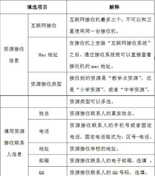 填写资源接收联系人信息时,需要填写联系人的真实姓名、手机号、或固定电话、接收学校的地址、邮编,上述这些都是必填项目,邮箱和QQ号码可以选填,各填写项目的解释如表