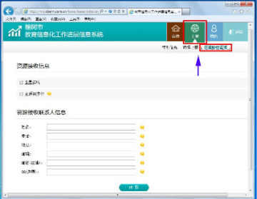 2、进入学校教育信息化工作进展信息系统,在界面上方处,点击“上报”按钮,选择“资源接收管理”子栏目,进入资源接收管理信息填报界面,如图,在这个界面,需要填写资源接收信息和资源接收联系人信息。