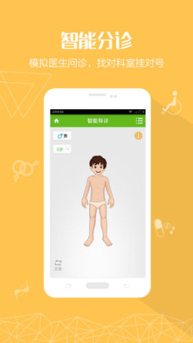 3、智能导诊:哪里不适点哪里,模拟医生问诊,推荐相关科室,帮您针对性挂号