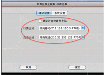 选择系统菜单“招商证券全能版/系统设置”或者快捷键(Command + ,) 打开对话框。选择“通讯设置”选项卡打开通讯设置界面: