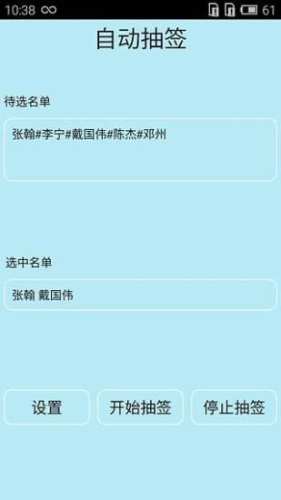 自动抽签可以在录入的候选人名单中,由系统随机产生1到多个确定名单,可以在设置里面设置需要随机抽取多少人,非常方便的一款抽签软件