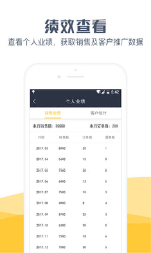 2. 绩效查看,查看个人业绩,获取销售及客户推广情况;
