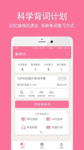 全能型韩语学习助手,让学习韩语变得简单。全新的科学计划背单词,以及使用记忆遗忘曲线安排复习,让你的韩语水平突飞猛进。