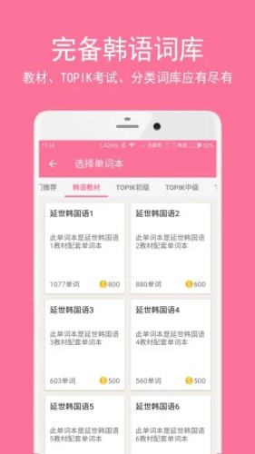 延世韩国语教材、TOPIK考试初级、中级、高级、以及各种分类词库,应有尽有。