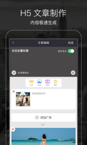 「H5内容极速制作」:原创功能可以在文章中任意添加,视频、音乐、广告推广信息、图文模块,一分钟可以制作出一篇公众号文章;