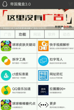帝国魔盒是一款多功能网络工具箱,网络资源盒子。包含快手视频解析,QQ音乐一键加速,拆字,cf准星,球球代点,QQ群发器等多种游戏辅助和qq辅助功能,更多精彩等你来体验!