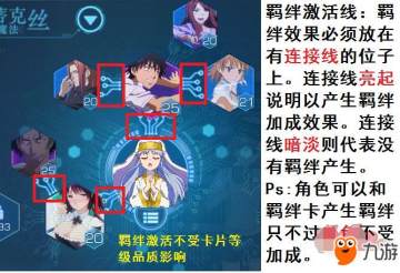 2:组合连线:羁绊卡无视品质,并且可以和角色本身产生羁绊效果(但是角色没有加成。只有卡有加成,PS:角色和羁绊卡产生的羁绊效果目前只适用2人组合不适用多人组合的羁绊生成)羁绊激活必须要有连线。如图所示。没有连线的话不触发羁绊。