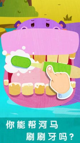 手指滑一滑,用小鸟的嘴巴为河马清洁口腔,抓住虫子抹上药膏,伤口再也不疼啦!