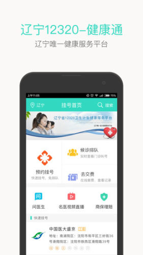 辽宁省健康服务平台,通过此平台患者可实现“预约挂号”、“候诊排队查询”、“检查检验查询”、“诊中缴费”、“就诊人、就诊卡管理”等,为患者提供方便快捷一体化的就医服务。