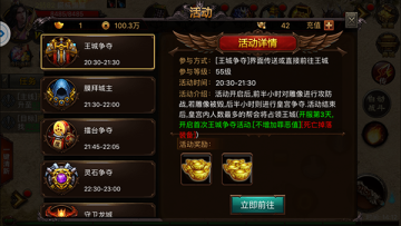 (1)新区开服第7天晚上开启首次攻城战,首次占领王城的帮会将会获得5000元宝攻城红包。
