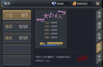 装备称号不仅能够增加人物属性,还能显示在角色的头顶上,真是挂机游街的必备佳品,撩妹耍帅的不二之选! 特别是下面这个称号,有没有感受到透出屏幕的爱意?