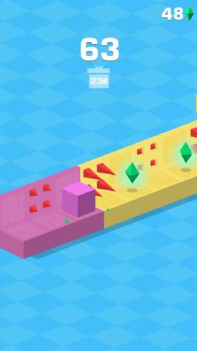 游戏的操作很简单,控制道路上的小方块,在恰当的时机点击屏幕,越过障碍,避免跌落或损伤。