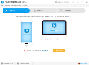 注意,如果检测手机失败,请参照弹出窗口上的提示进行处理,处理完后请点击“重新检测”按钮
