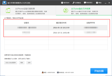 2、运行强力苹果恢复精灵,点击“从iTunes备份文件恢复”。之前有借助iTunes软件备份过手机数据,运行强力苹果恢复精灵时,软件会检测出iTunes备份文件。选择需要恢复微信数据的设备后,点击“开始扫描”。
