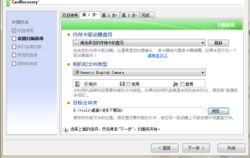 3、请根据使用向导来进行操作软件,第一步包括了内存卡驱动器盘符、相机和文件类型、目标的文件夹等;