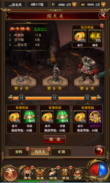 3、闯天关奖励分为通关奖励(包含经验、金币、元宝)和每日奖励(金币、威名)。