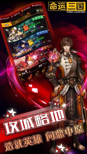 《命运三国》属于策略卡牌养成类游戏,三国分魏蜀吴阵营,根据历史人物的特性划分了物理法系坦克辅助四种职业,玩家可挑选6名英雄上阵和8个英雄人物缘分位上阵,上阵的武将还会开启毁天灭地的合击技能,到了75级后,玩家还能上阵神兽战斗,各种不同神兽会带来不同的战斗增益。游戏内挑战分剧情,精英,英雄,日常等,玩家们可每日从中获取海量资源。竞技场,过关斩将,三国鼎立,黄巾来袭,群雄争霸,天书争夺,讨伐董卓等系列玩法等你来战。