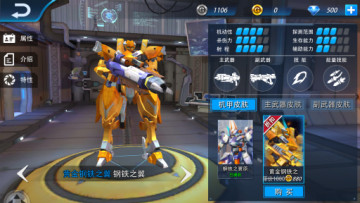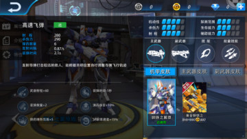 皮肤区域有机甲的三种皮肤:分为机甲皮肤,主武器皮肤,副武器皮肤,皮肤可以通过购买或活动获得。根据自己的喜好购买不同样式的皮肤,除了能在对局中与众不同,还有可观的属性加成噢。