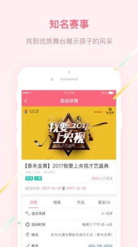 1、优质通告,一网打尽 : 为每位家长个性化推荐优质活动、赛事及课程,提供快捷的报名服务。