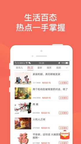 海量热文,涉及情感美文,生活常识,搞笑段子,社会历史等内容,转发即可获得收益,每天仅需1分钟时间分享,即可赚取3~12元。