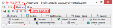 2、打开 autoruns(win7以上系统,如果需要修改启动项,请使用管理员身份运行) ,按 Esc 键 停止扫描,点击 【Opitons】->【Filter Options】