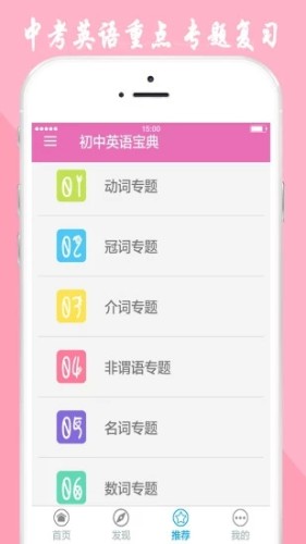 (2)发现页面-{初中英语重点知识}:包含初中英语词性、句型、作文、语法、考题及答题策略等专题知识,帮助初中同学针对性的掌握英语难点、重点;
