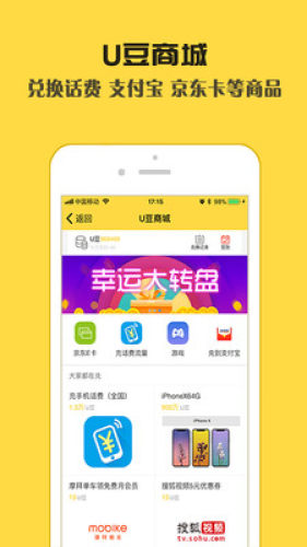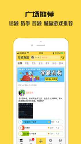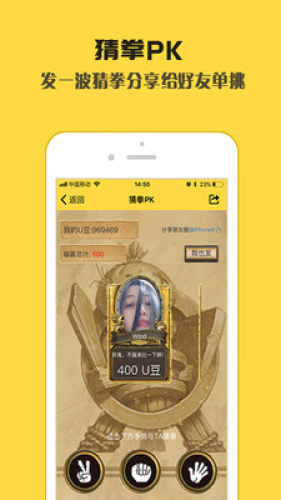 友输友赢app,广场推荐,话题、猜拳、答题、输赢游戏推荐;答题有奖,答对一半可获奖,先答对者先得奖;猜拳PK,发一波猜拳分享给好友单挑;还有U豆商城,兑换话费、支付宝、京东卡等商品。