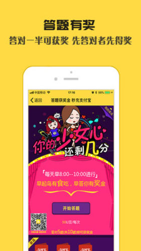 具体为:答对5题可获2元,答对7题可获5元,答对9题可获10元,答对10题可获500元哦!每天早8:00–10:00进行此活动。终于到了厂商为你知识喝彩的年代了,选择题哦,瞎蒙总是会滴吧,快来试试吧!