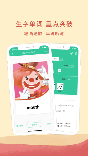针对语文生字,提供读音部首、笔画笔顺、释义组词,既可按册次篇目翻查,也可直接搜索;针对英语单词,提供单词听写、形象化记忆,帮助学生夯实语言基础能力。