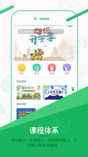 1.丰富的课程体系:涵盖少儿英语,幼儿拼音识字,幼小衔接数学提高,语言能力训练,快速记忆,故事绘本,成语故事,阅读写作,行为习惯课等