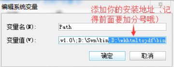 安装好以后需要在系统环境变量变量名为”Path”的后添加:;D:\wkhtmltopdf\bin 也就是你安装的目录。安装好以后重启电脑。